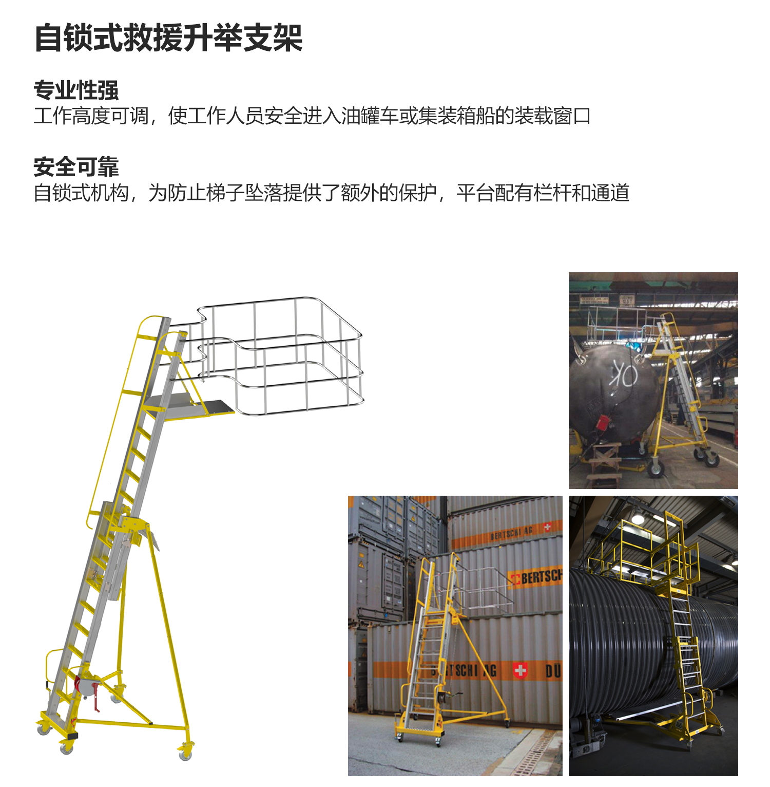 self-locking rescue lifting device can make the staff safely enter the loading window of the tank truck or container ship. The telescopic ladder of the platform can adjust the working height to the required height. After the height is adjusted, the movement of the telescopic ladder and the fixed ladder is locked, which provides additional protection to prevent the ladder from falling. Platforms provide barrier-free access from ladders to work windows, and railings prevent tripping or falling aft