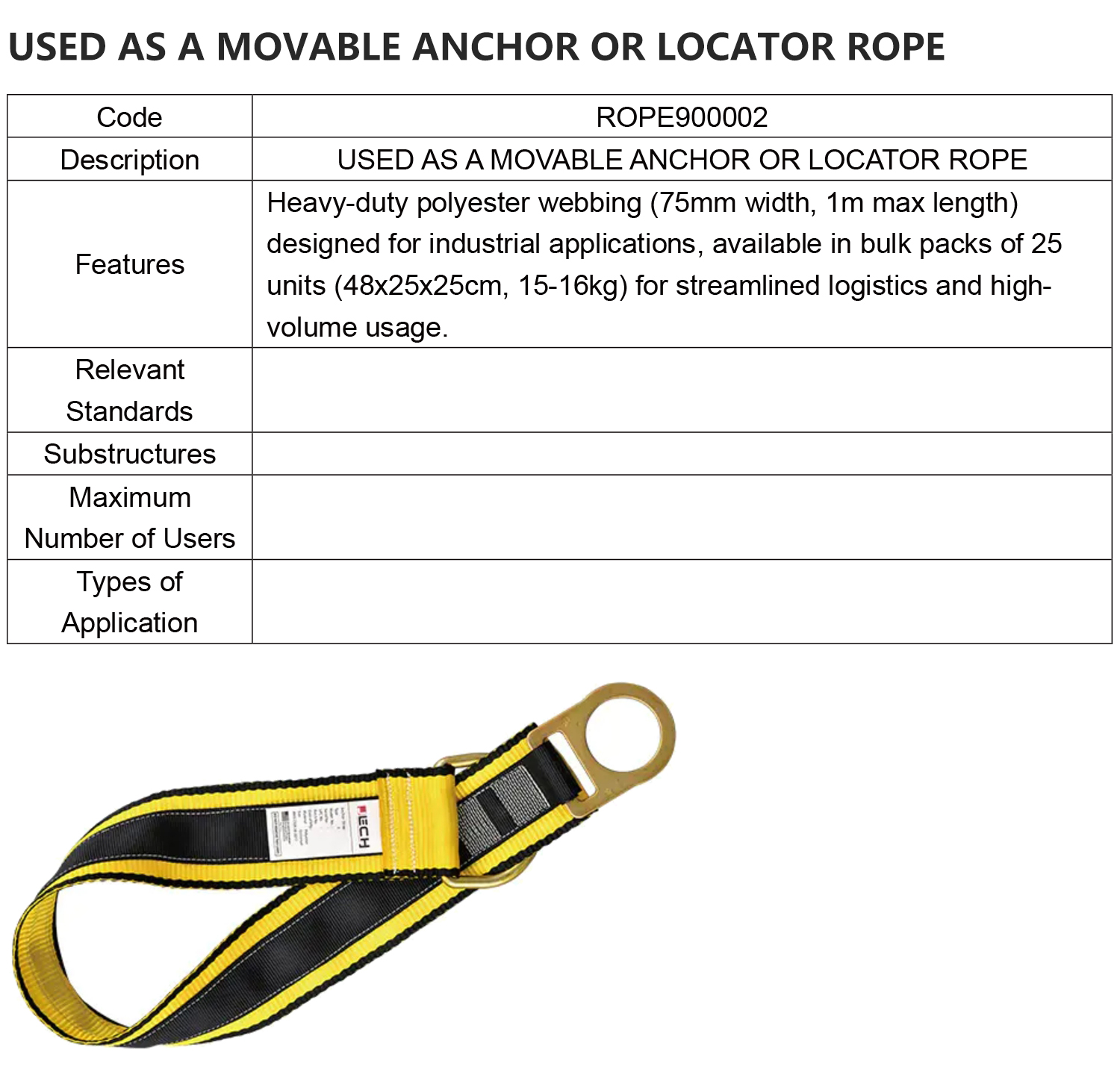Heavy-duty polyester webbing (75mm width, 1m max length) designed for industrial applications, available in bulk packs of 25 units (48x25x25cm, 15-16kg) for streamlined logistics and high-volume usage.