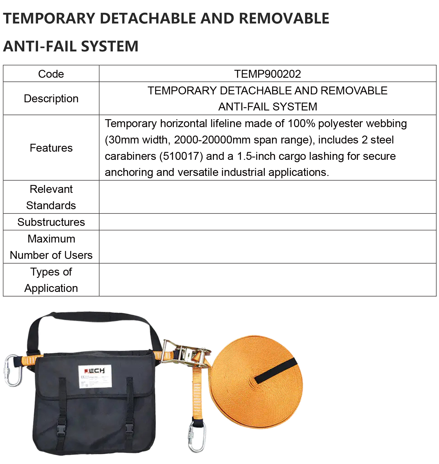 Temporary horizontal lifeline made of 100% polyester webbing (30mm width, 2000-20000mm span range), includes 2 steel carabiners (510017) and a 1.5-inch cargo lashing for secure anchoring and versatile industrial applications.
